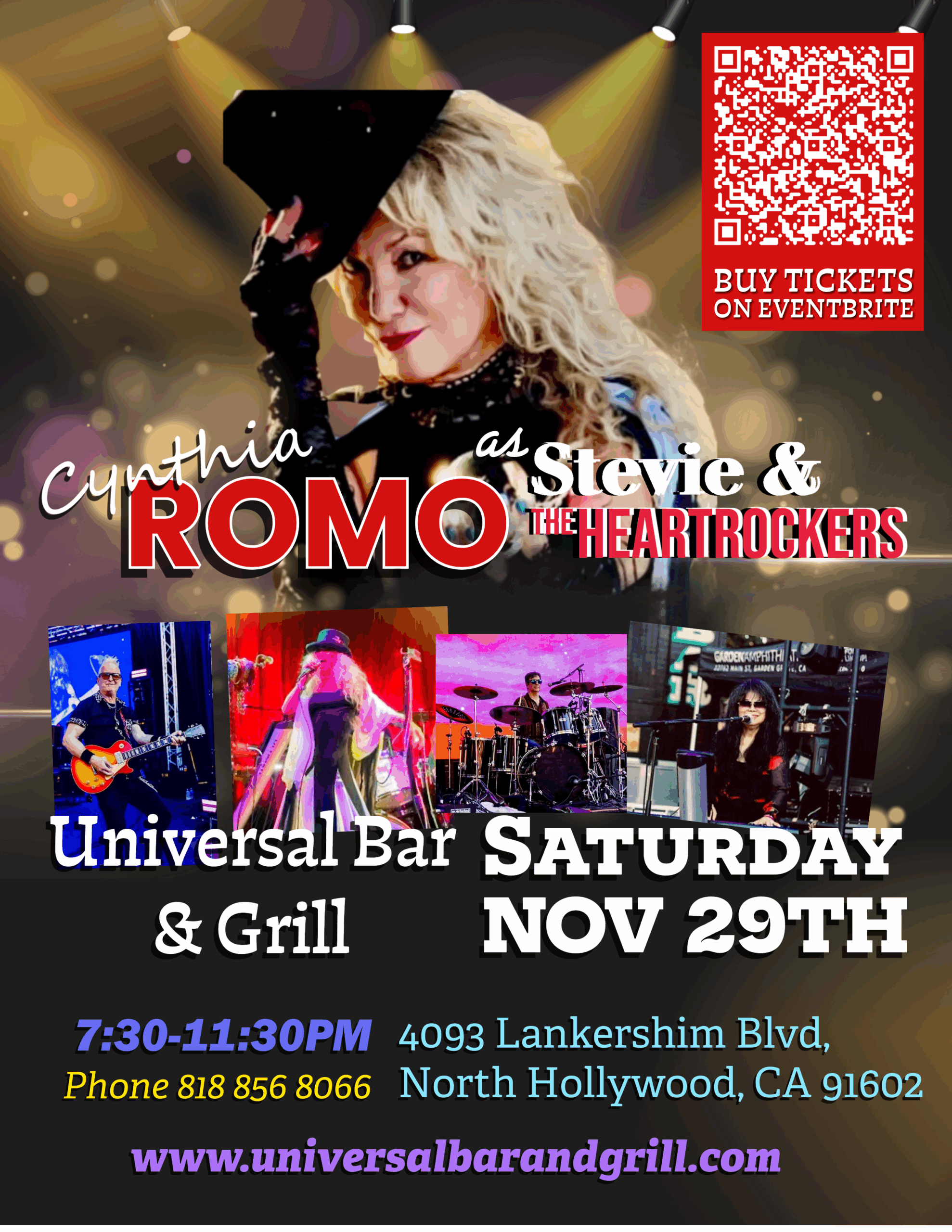 Meet Stevie & The HeartRockers Tribute Band. Come and enjoy the music of Stevie Nicks and Tom Petty. Starring Cynthia Romo and AJ Mitchell and the HeartRockers Band.